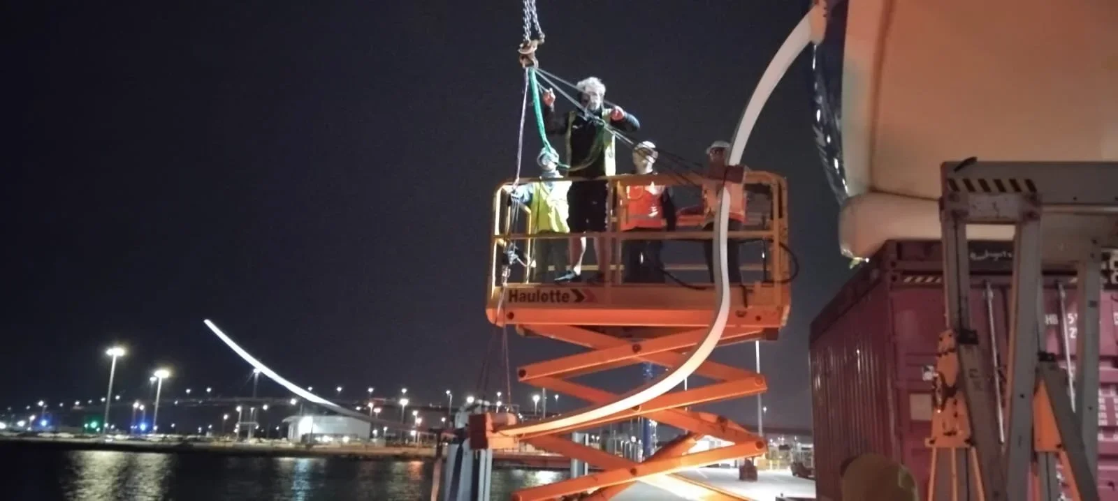 The Strait Link team had placed two containers 8 m apart, on which the boat would sit with the keel in the middle. The clock was ticking from our moment of arrival, and it was tense work. While the crane set up, the shore team placed our bean bags on top of the containers, then the boat was lifted and placed on top of the bean bags. As soon as the boat was secured, two teams worked on getting foils out. Foils supported by the crane, one team on a scissor lift outside, one team inside the boat lowering and releasing. It took around four hours to get both foils out and on deck. It got dark, and we continued under the flood lights. Pizzas arrived, the volunteer crews changed. Next, the keel had to come off. The crew outside placed two gantries on either side of the keel, then took the weight of the bulb on chain blocks. The team inside worked to loosen keel bolts, which fought us every step of the way. Eventually, the keel was lowered out of the boat at around 0230, and by 0300, we were back in the water, with two hours to spare before the ship got back. The boat was back in its berth at 0430 after an epic 12 hours, then Paul, the volunteer RIB driver, still had an hour to get back to his berth.